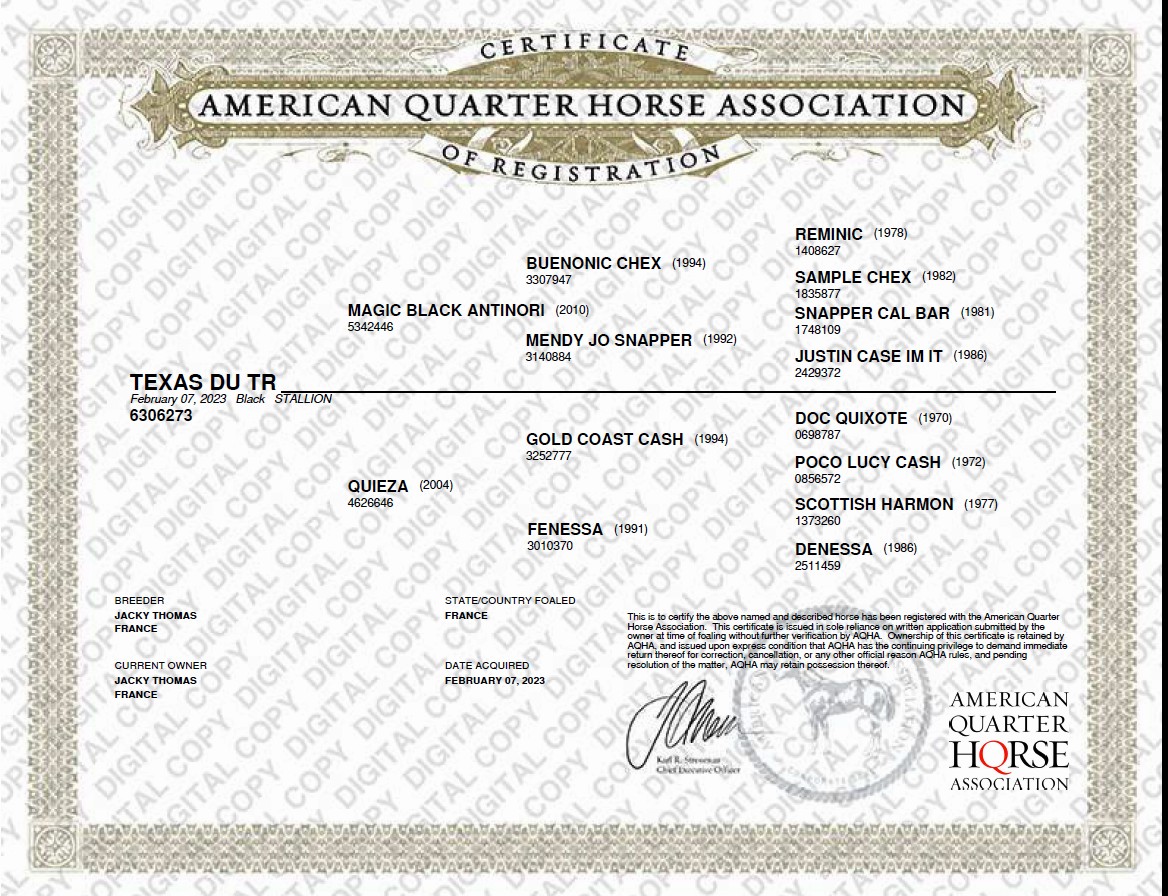 Fils de notre jument Quieza il a hérité de sa mère son caractère placide non émotif. Son grand père Gold Cost Cash importé en France en 1995 était champion de cutting.